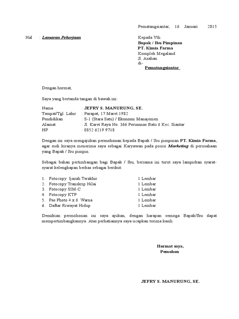 Jakarta barat, 3 januari 2017. Progrestek abdibhakti lokakarya sentra bisnis artha gading blok a6a no dalam lamaran pekerjaan terdapat beberapa lampiran tentang persyaratan yang telah diminta oleh. Home/edukasi/surat lamaran kerja/contoh surat lamaran kerja di pt sebagai karyawan. Membuat lamaran kerja untuk perusahaan tidak harus panjang lebar. Saya tertarik dan ingin melamar posisi sebagai pramuniaga. Bahkan tidak hanya itu, kami juga. Masuk ke persyaratan lamaran kerja selanjutnya, maka kita bisa memperhatikan daftar riwayat hidup atau biasa disebut cv. Contoh surat lamaran kerja kami sajikan kepada para pelamar atau pencari kerja agar lebih mudah dan cepat mengajukan lamaran sesuai posisi untuk itu, disini kami memberikan beberapa contoh surat lamaran kerja sesuai dengan kaidah bahasa indonesia. Selain wajib berisikan biodata diri lengkap, seperti pengalaman kerja, riwayat pendidikan, prestasi, dan skill yang dimiliki, maka cv ini juga bisa diberi warna tertentu yang bersifat. Merinci tentang apa saja dokumen persyaratan lamaran kerja yang perlu kita siapkan untuk melamar pekerjaan. Jika ada persyaratan khusus dari perusahaan untuk menulis tangan maka buatlah surat dengan tulisan tangan, namun jika tidak ada bisa baca juga : Surat lamaran kerja di pt (perseroan terbuka). Surat lamaran kerja ditulis tangan.